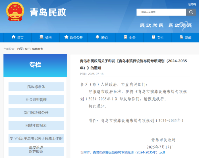 《规划》是落实《青岛市国土空间总体规划(2021-2035年)》发展目标、指导全市殡葬服务设施规划建设的重要依据,对优化全市各类殡葬设施布局和功能具有重要意义。《规划》主要包括总则、现状与问题、规划原则与发展目标、殡葬设施标准与需求预测、殡葬设施总体布局及各区(市)布局规划、近期建设规划、实施保障措施等内容。