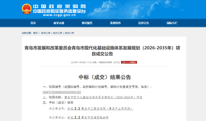 近日,我院成功中标青岛市现代化基础设施体系发展规划(2026-2035年)编制项目。按照采购要求,中标项目包含青岛市现代化基础设施体系发展规划(2026-2035年)主报告和两个专题研究报告等编制任务。