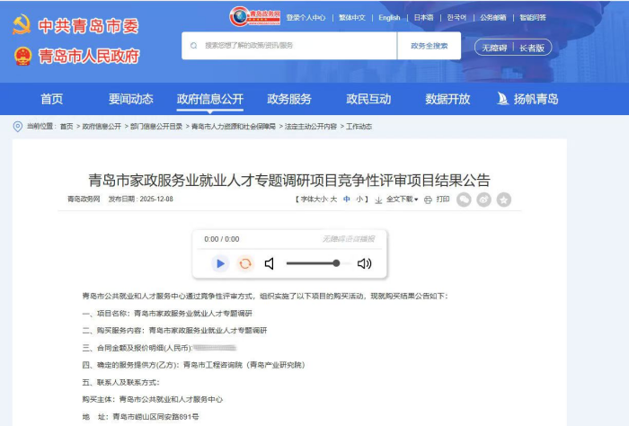 中标后,调研工作组将坚持系统思维与需求导向,深入开展实地走访与数据采集,全面梳理青岛市家政服务业的行业现状、人才结构与发展需求,精准识别就业市场的优势潜力与现实挑战。立足行业发展实际,科学把握家政服务业就业面临的新形势与新特点,系统分析从业人员培训、就业、职业发展等关键环节,统筹提出促进就业、提升素质、完善政策的对策建议,全面构建反应行业实情、贴近人才需求、具备实操价值的调研成果,为青岛市家政服务业提质扩容、就业人才队伍建设提供扎实依据和有效支撑。(完)