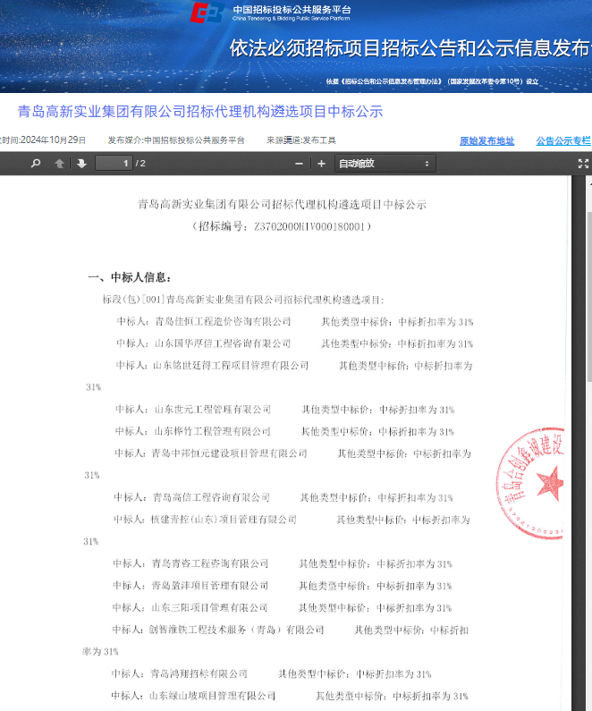 此次成功入选青岛高新实业集团有限公司招标代理机构库标志着青咨公司在高新区代理业务领域迈出了重要一步,开辟了新的业务区域。(完)